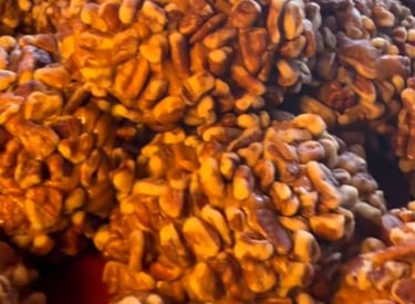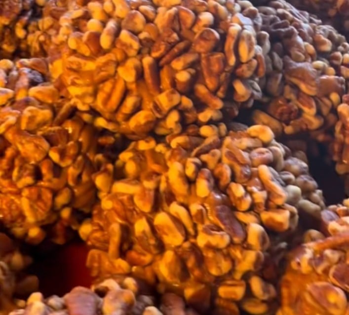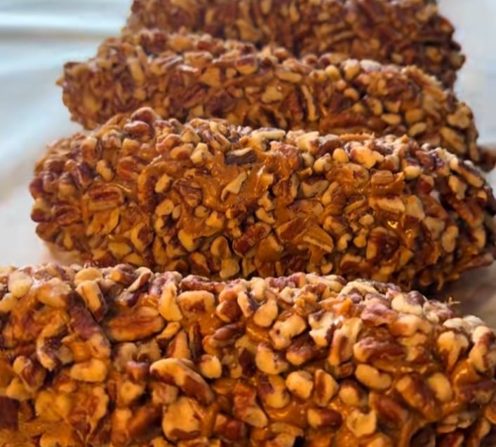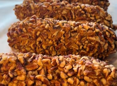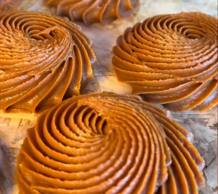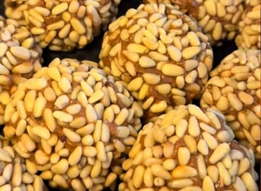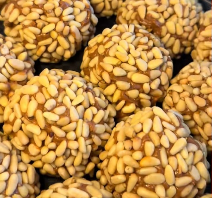 Creamy dulce de leche texture with the crunchy texture of toasted pine nuts.